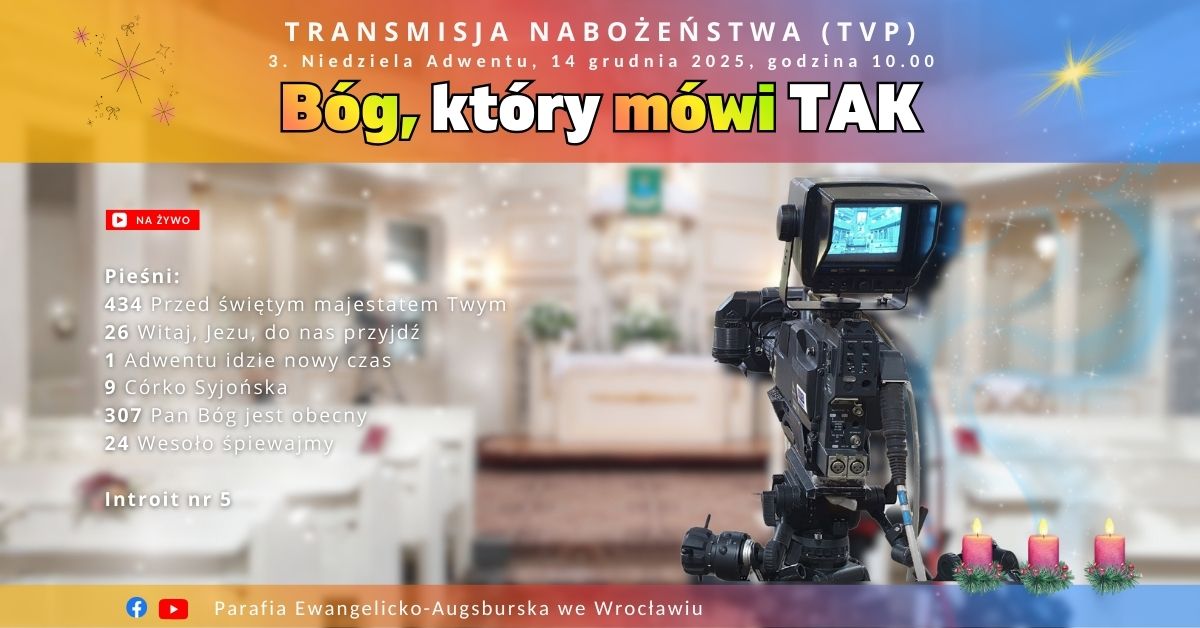 W najbliższą niedzielę nasze nabożeństwo będzie wyjątkowe – odwiedzą nas kamery Telewizji Polskiej. Choć premiera telewizyjna odbędzie się za tydzień, dzięki uprzejmości realizatorów będziemy mogli uczestniczyć w nabożeństwie na żywo również przez Internet.