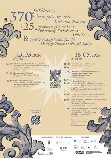 Serdecznie zapraszamy do wspólnego świętowania! Już 16 maja 2026 r. spotkajmy się na wspólne obchody:Święta ewangelickich parafii Dolnego Śląska i Górnych Łużyc 370 lat poświęcenia Kościoła Pokoju w Jaworze 25 lat od wpisania na listę Światowego Dziedzictwa Kultury UNESCO Czeka nas bogaty program pełen inspirujących wydarzeń, aktywności i spotkań: 10:00–16:00 – TargWIĘCEJ