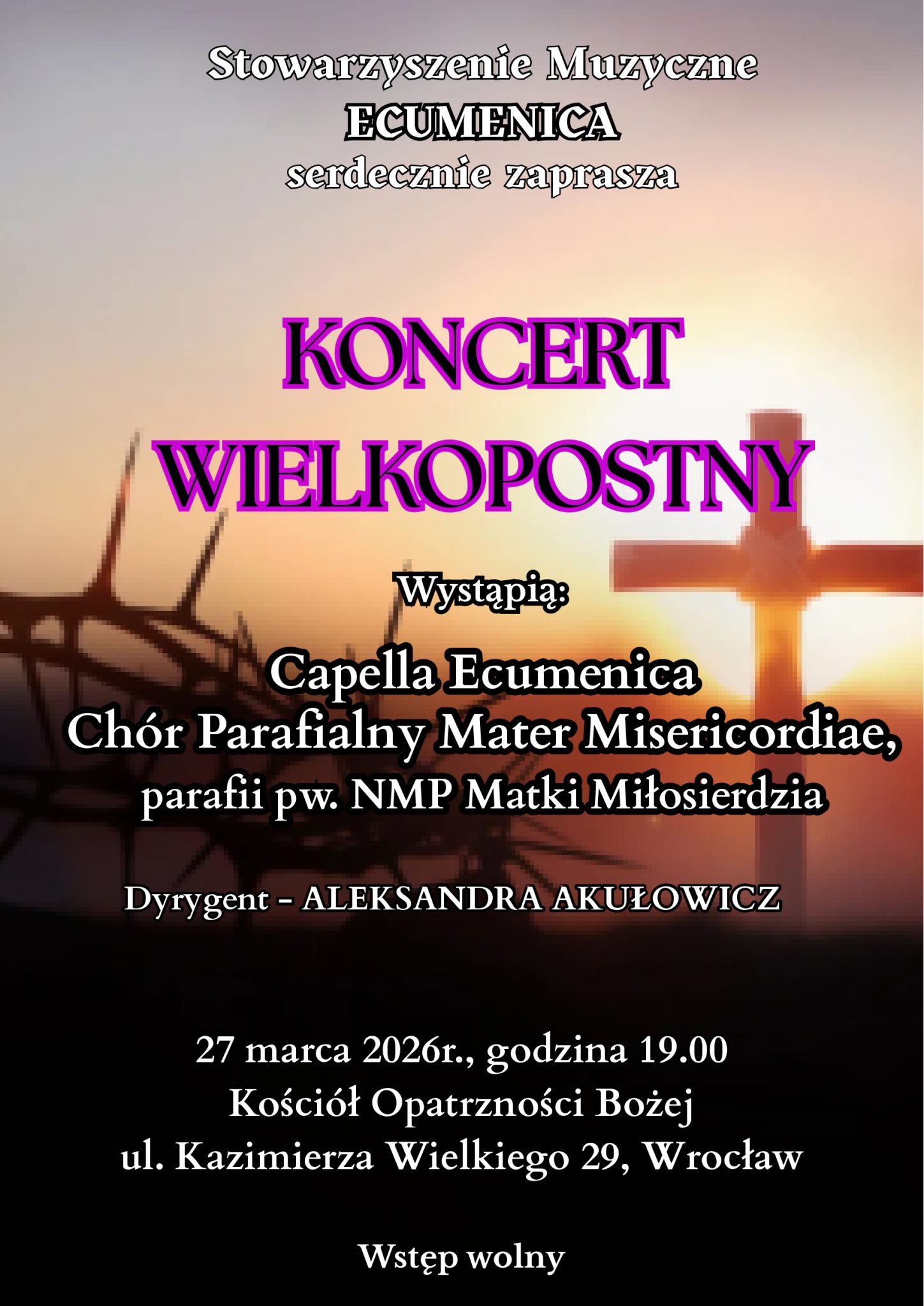 Serdecznie zapraszamy na koncert wielkopostny, który odbędzie się w naszym kościele. Będzie to wyjątkowy czas refleksji i muzyki pasyjnej w wykonaniu zaproszonych zespołów. Wystąpią: Capella Ecumenica oraz Chór Parafialny Mater Misericordiae parafii pw. NMP Matki Miłosierdzia. Całość poprowadzi dyrygent Aleksandra Akułowicz. Wstęp na wydarzenie jest wolny.