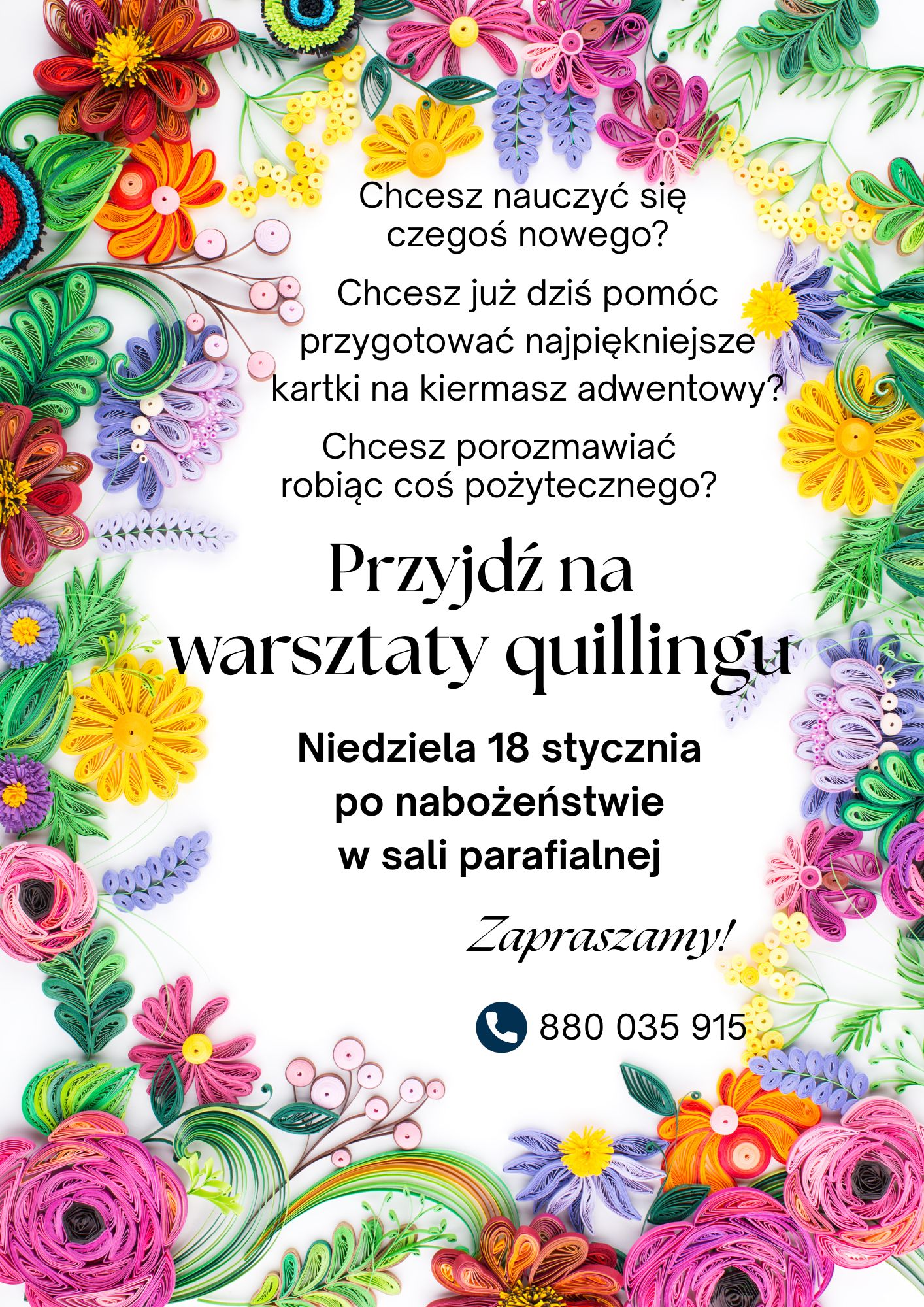 Zapraszamy wszystkich zainteresowanych na warsztaty quillingu, które odbędą się w najbliższą niedzielę po nabożeństwie w naszej sali parafialnej. Poza zdobyciem nowej umiejętności będzie można porozmawiać i spędzić czas w dobrym towarzystwie. Więcej informacji można uzyskać w kancelarii parafialnej i u Pani Iwony Orawskiej