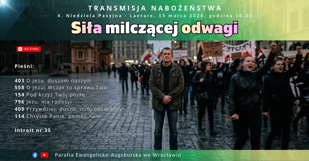 📖 Pasyjne Nabożeństwo Dziewięciu Czytań i Pieśni. Serdecznie zapraszamy na wyjątkowe, ekumeniczne nabożeństwo pasyjne, organizowane przez naszą parafię we współpracy z Fundacją Lumen de Lumine. Podczas nabożeństwa wsłuchamy się w dziewięć biblijnych czytań prowadzących przez historię zbawienia oraz w pieśni pasyjne, które pomogą nam przeżyć ten czas refleksji i modlitwy. Będzie to wspólne spotkanie wokół Słowa Bożego i muzyki, otwarte dla wszystkich pragnących zatrzymać się na chwilę w atmosferze skupienia i nadziei. Nabożeństwu przewodniczyć będzie bp Marcin Orawski, biskup diecezji wrocławskiej Kościoła Ewangelicko-Augsburskiego.
