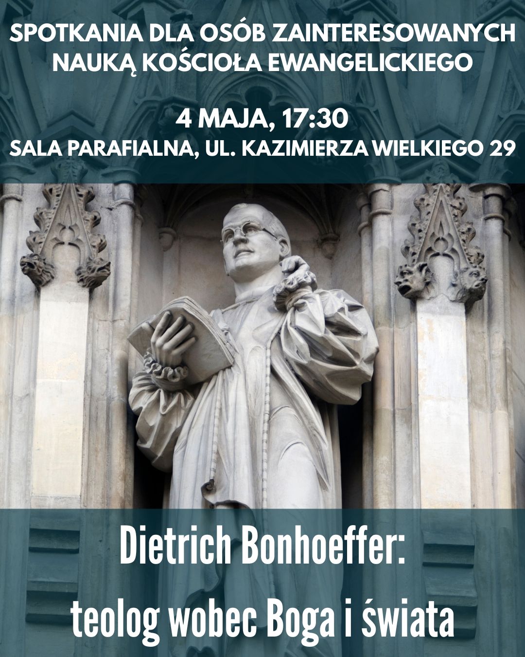 Najbliższe spotkanie odbędzie się w poniedziałek, 4 maja 2026 r. o godzinie 17:30 w sali parafialnej (z tyłu budynku kościoła). Spotkanie będzie poświęcone tematowi: „Dietrich Bonhoeffer – teolog wobec Boga i świata”
